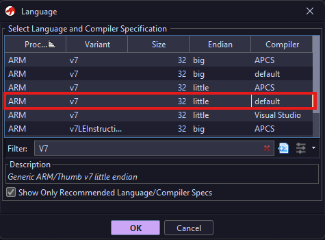 Click the three dots next to the Language field to open the “Select Language” dialog. From here, choose the correct architecture for your binary: