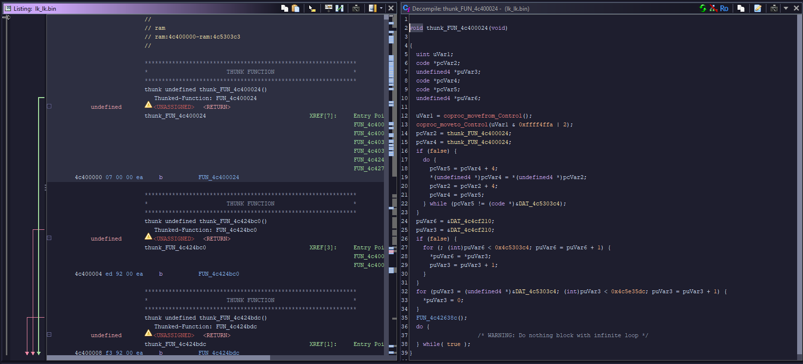 $ python3 -m lkpatcher lk.bin -d lk[INFO] MediaTek bootloader (LK) patcher - version: 4.0.3 by R0rt1z2[INFO] Successfully loaded 6 patches in 4 categories[INFO] Loaded image from lk.bin with 2 partitions (version 1)========================================Partition Name : lkData Size : 1246148 bytesAddressing Mode : 0xffffffffMemory Address : 0x4c400000========================================[INFO] Successfully dumped partition lk to lk_lk.binThis will give you a file called lk_lk.bin, which is the actual LK binary we want to reverse engineer.