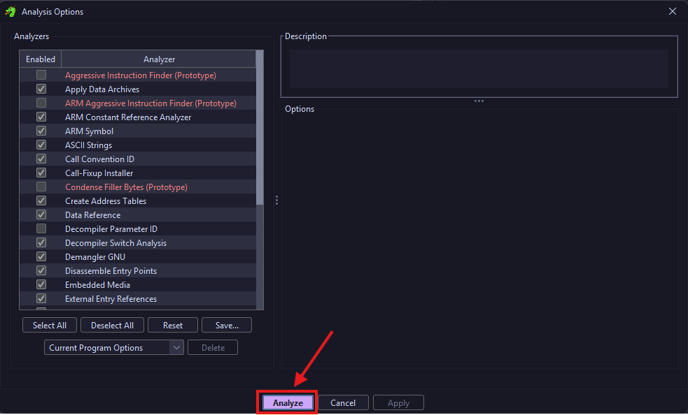 Finally, trigger auto-analysis by pressing A in the main CodeBrowser window. In the dialog that appears, leave everything as is and click OK.