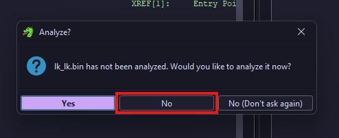 You’ll be prompted to run auto-analysis. It is important that you choose No here, as we still need to configure a few things first. Running it now will only cause confusion and make things harder.