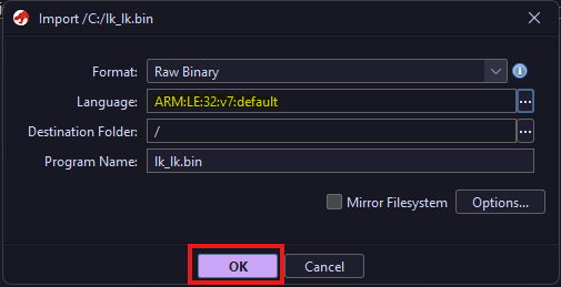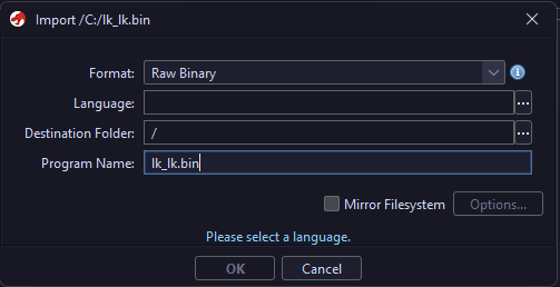 Drag and drop the lk_lk.bin file into the project window. This will open the “Import File” dialog.
