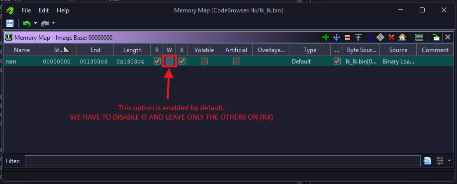 In the Memory Map, select the “ram” section and disable the “W” (write) permission, which is enabled by default. Only “R” (read) and “X” (execute) should remain enabled.