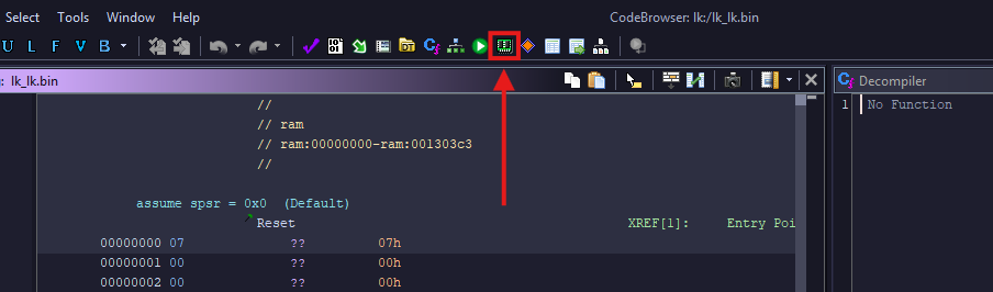 Since we chose not to run auto-analysis, go to the top menu bar and locate the icon that looks like a RAM stick. Click it to open the Memory Map window.
