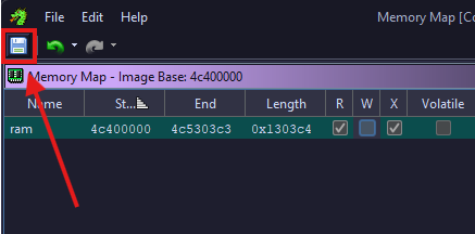 Click the Save icon in the top left corner to apply the changes, then close the Memory Map window and return to the CodeBrowser.