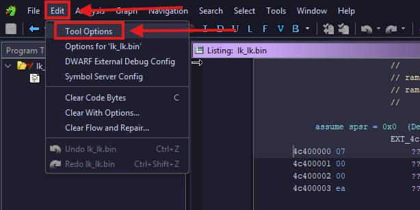 In the CodeBrowser, go to the top menu bar and click Edit > Tool Options to open the Tool Options dialog.