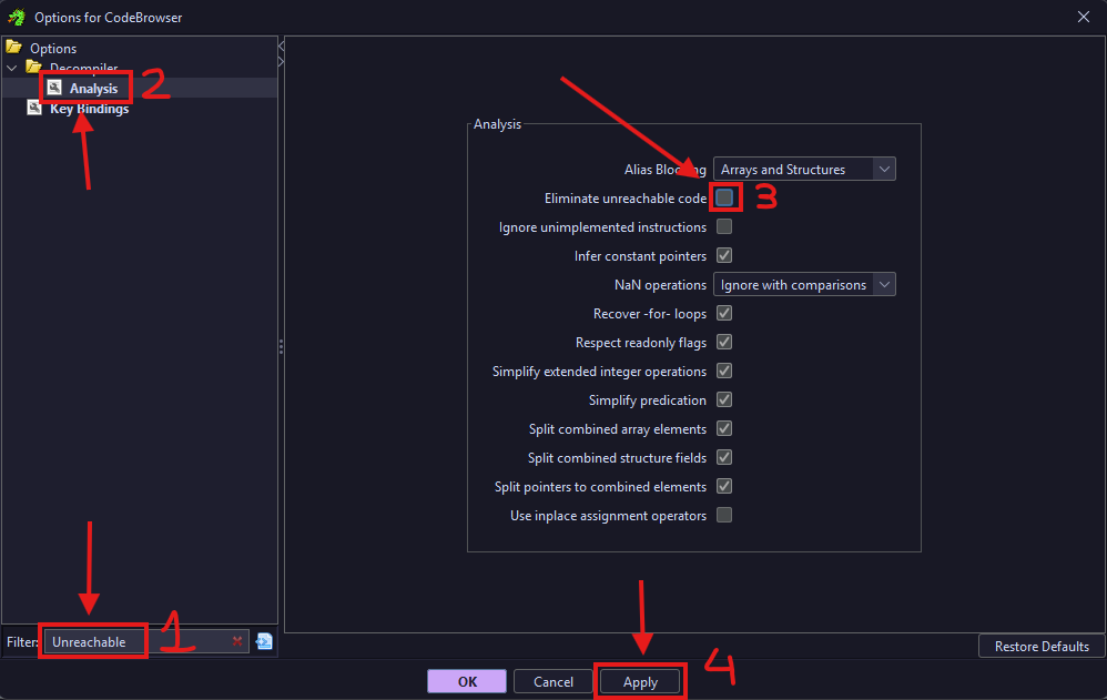 Search for “Unreachable”, then go to Decompiler > Analysis and disable the “Eliminate Unreachable Code” option (enabled by default). Click Apply, then OK to save.